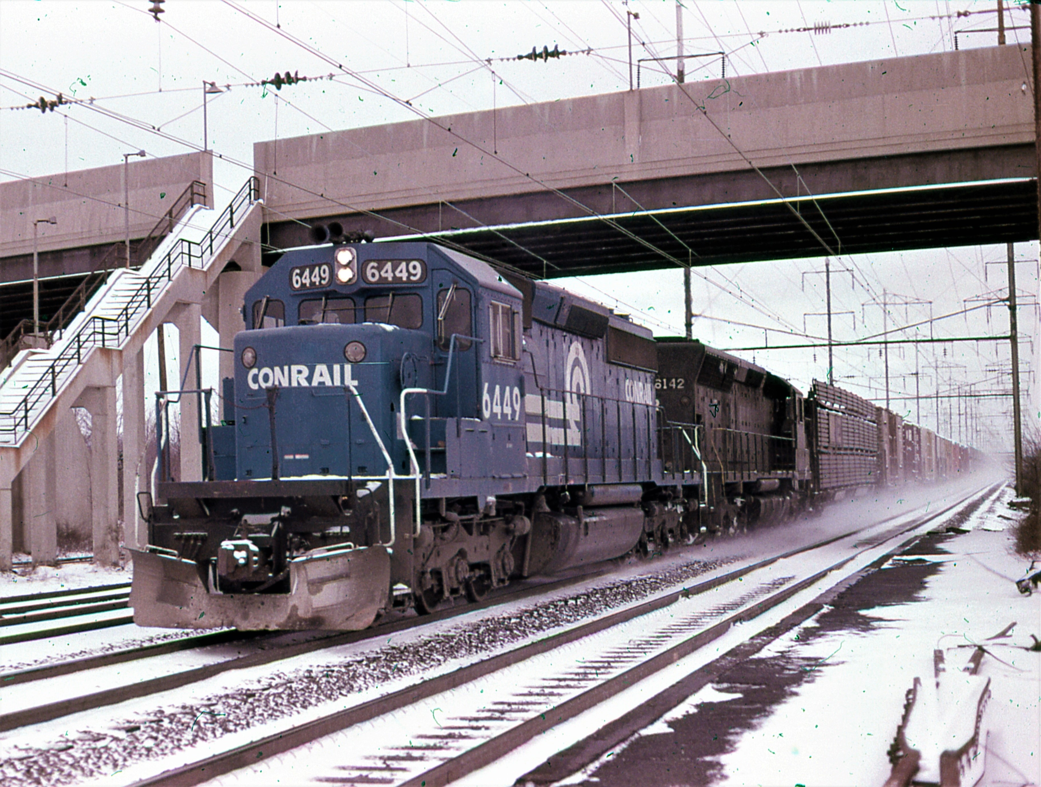 SD40-2 #6449 & SD-45 #6142. westbound in the snow at Adams Station, North. Brunswick. Jan 19, 1980