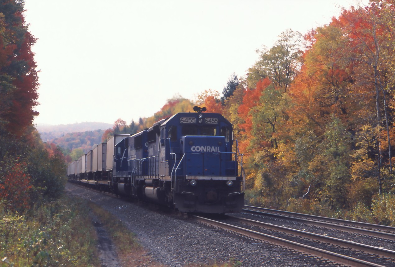 For all the SD40/-2's ConRail had, they were not common on the Boston Line. SD40-2 6455 leads a TV99 near MP 135 in Washington, MA. on Oct. 9, 1997. The engineer hasn't "forgotten" his lights, there's a reason.