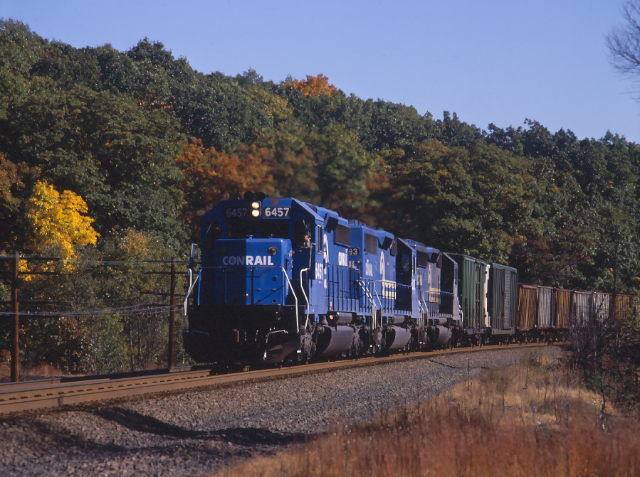 CR 6415 leads an out of place B36-7 on a ZBB ore train at Birdsboro PA in 1992