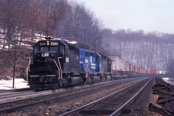 When I first saw a C32-8, I swore someone had beat up a locomotive with an "ugly stick." It didn't take long for me to appreciate the look. No. 6619 leads eastbound Conrail TV6 downgrade, east of Bancroft, MA, on June 13, 1987.