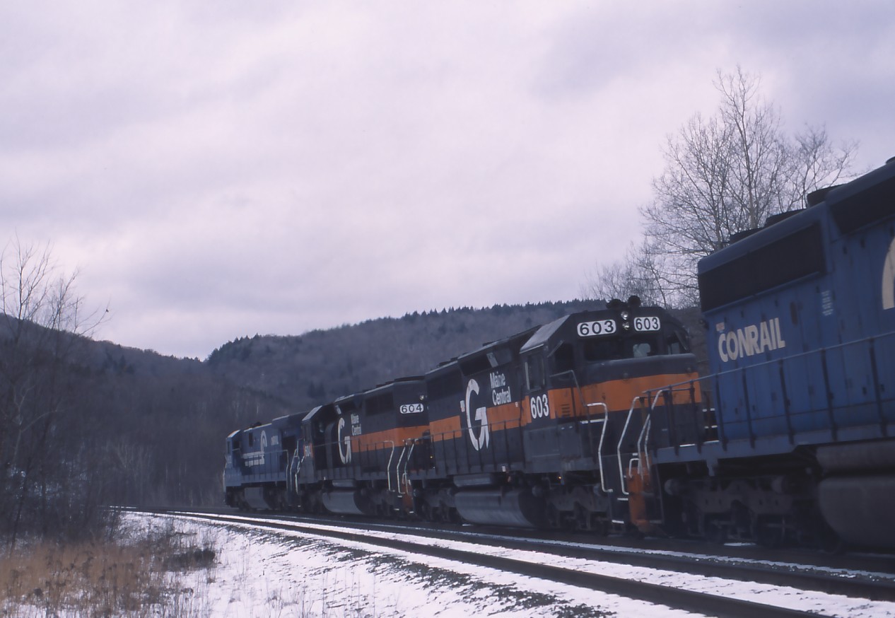 MEC/GTI SD40's 603 and 604 working off horsepower hours on BOSE in Middlefield, MA. on March 19, 1992.