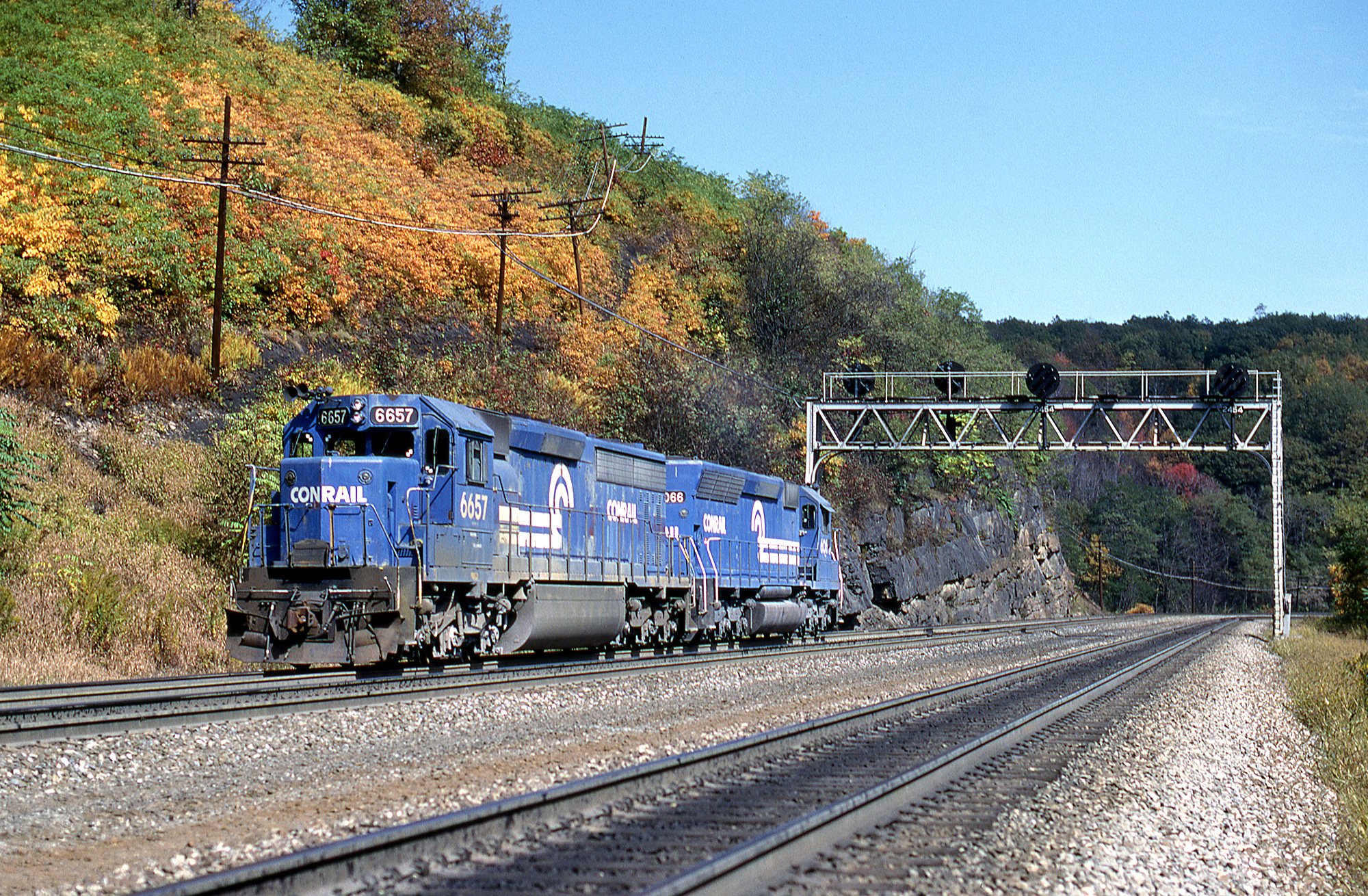 A westbound Conrail light helper climbs the East Slope, east of Bennington, PA, 10/3/82 with SD45-2 No. 6657 and SD45 No. 6066. With the amount of EL paint showing through on No. 6657, one has to wonder if it was repainted with watercolors.