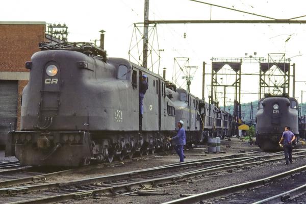 After a crew change, a GG-1 engineer pauses by ex-EL Bicentennial SDP-45 6669 (ex-EL 3638) outside the Enola shops on a dreary May 7, 1977.