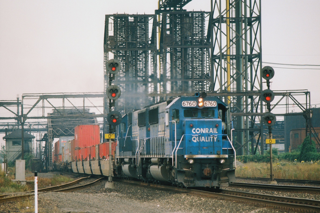 A pair of Conrail SD50s led by No. 6760 hustle a westbound stack train past Hick Tower and over the Indiana Harbor Channel bridge, in September 1998. Doug Davidson photo with permission