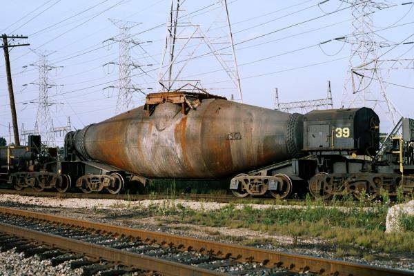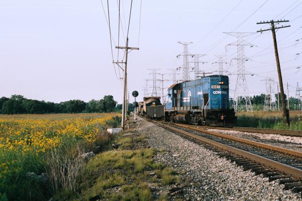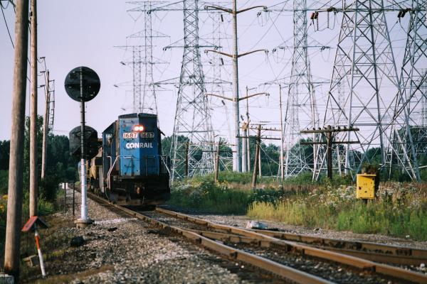 A pair of Conrail SD50s led by No. 6760 hustle a westbound stack train past Hick Tower and over the Indiana Harbor Channel bridge, in September 1998. Doug Davidson photo with permission