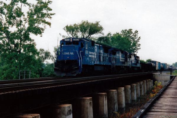 Conrail SD50 6764 is seen leading a westbound stack train across Montezuma Swamp at Fox Ridge, NY in the early 1990s.