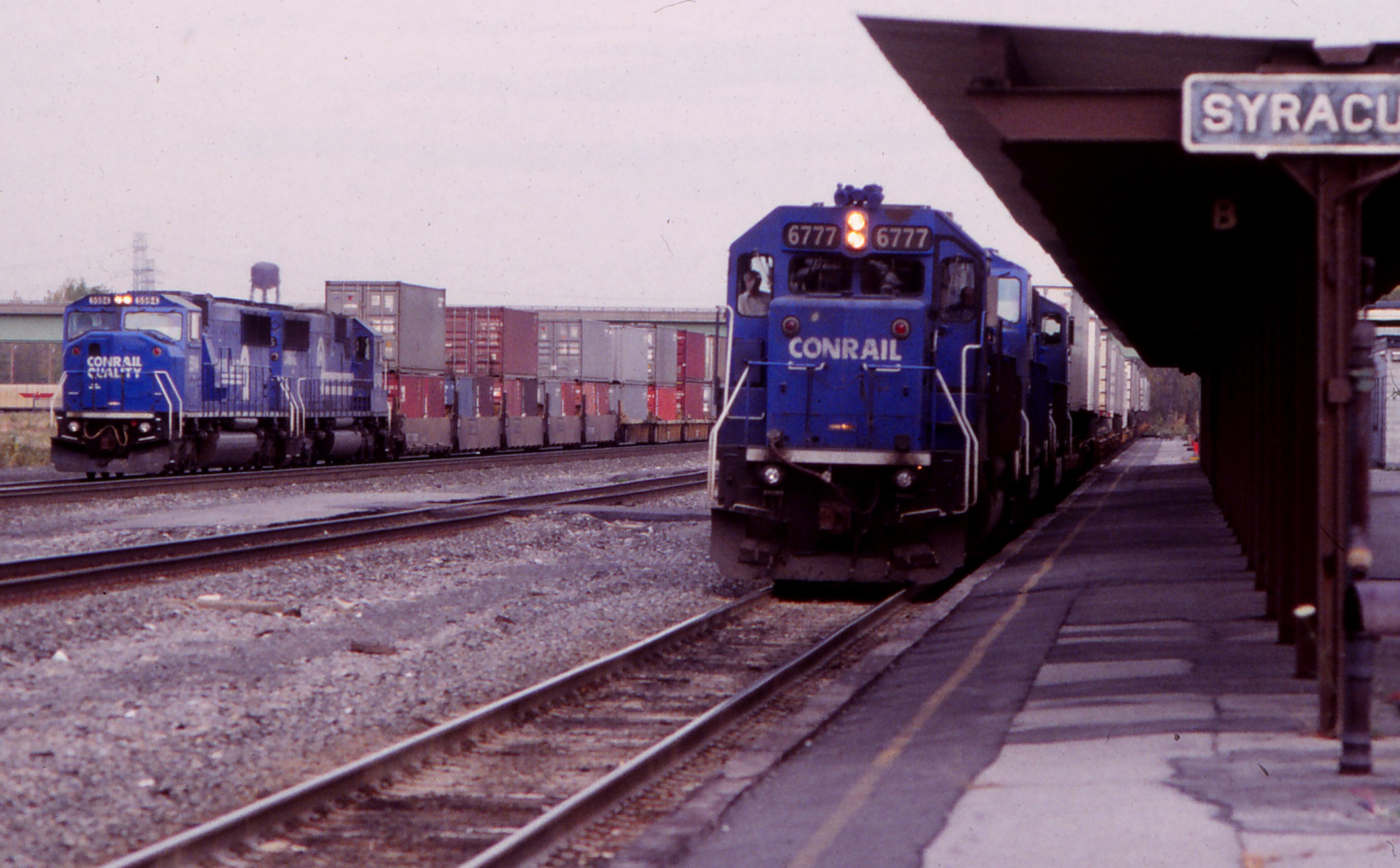 TVLA with CR 6777/5641/5628 and 91 cars, rolls past the Amtrak station while TV 261, behind CR 5594/6745, makes a pick up at Dewitt. It will head west with 145 stack platforms and 10 COFC.