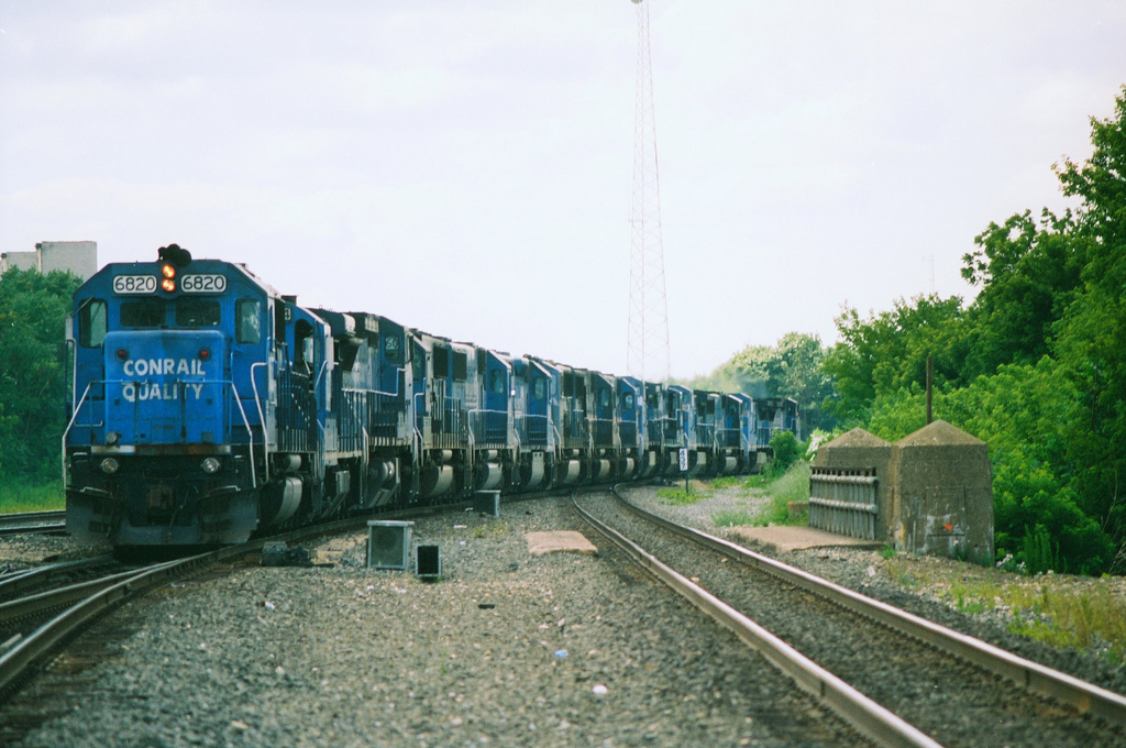 A massive Conrail westbound lite power move(ENS-501) of 15 units with SD50 No. 6820 bringing up the rear at South Bend, in June 1998. Most likely this was a Sunday or Monday when Conrail was more likely to run ENS sets to help balance power out for the week. Doug Davidson photo with permission