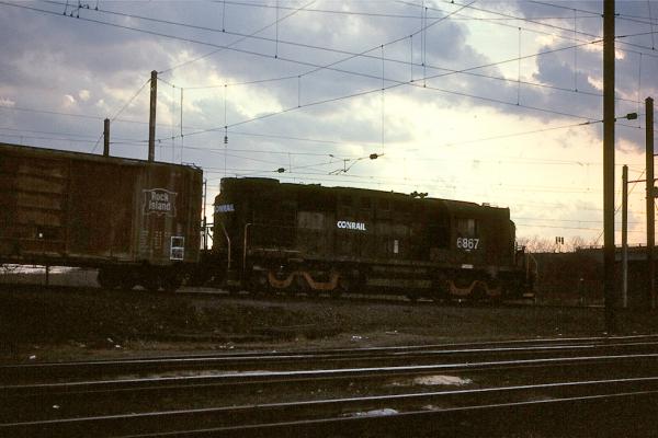 Near sunset, PC RSD-12 6866 works Morrisville yard in March, 1977.