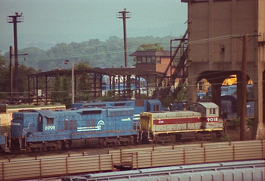 One of two ex-PC SD-7's, CR 6998, and SW-9 9018 (ex-EL 447) by the steam-era coaling tower at Enola in September, 1983.