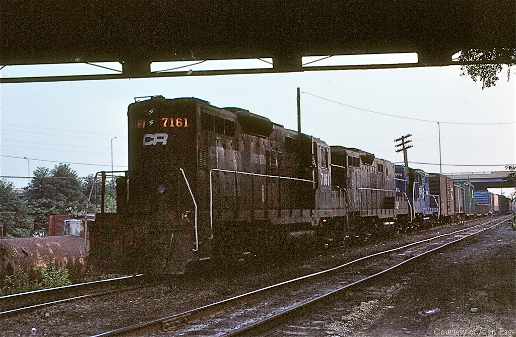CR GP9 7161 leads GP9B 3832 and GP10 7594 (ex-PC GP9 7258) at Enola yard in August, 1979.