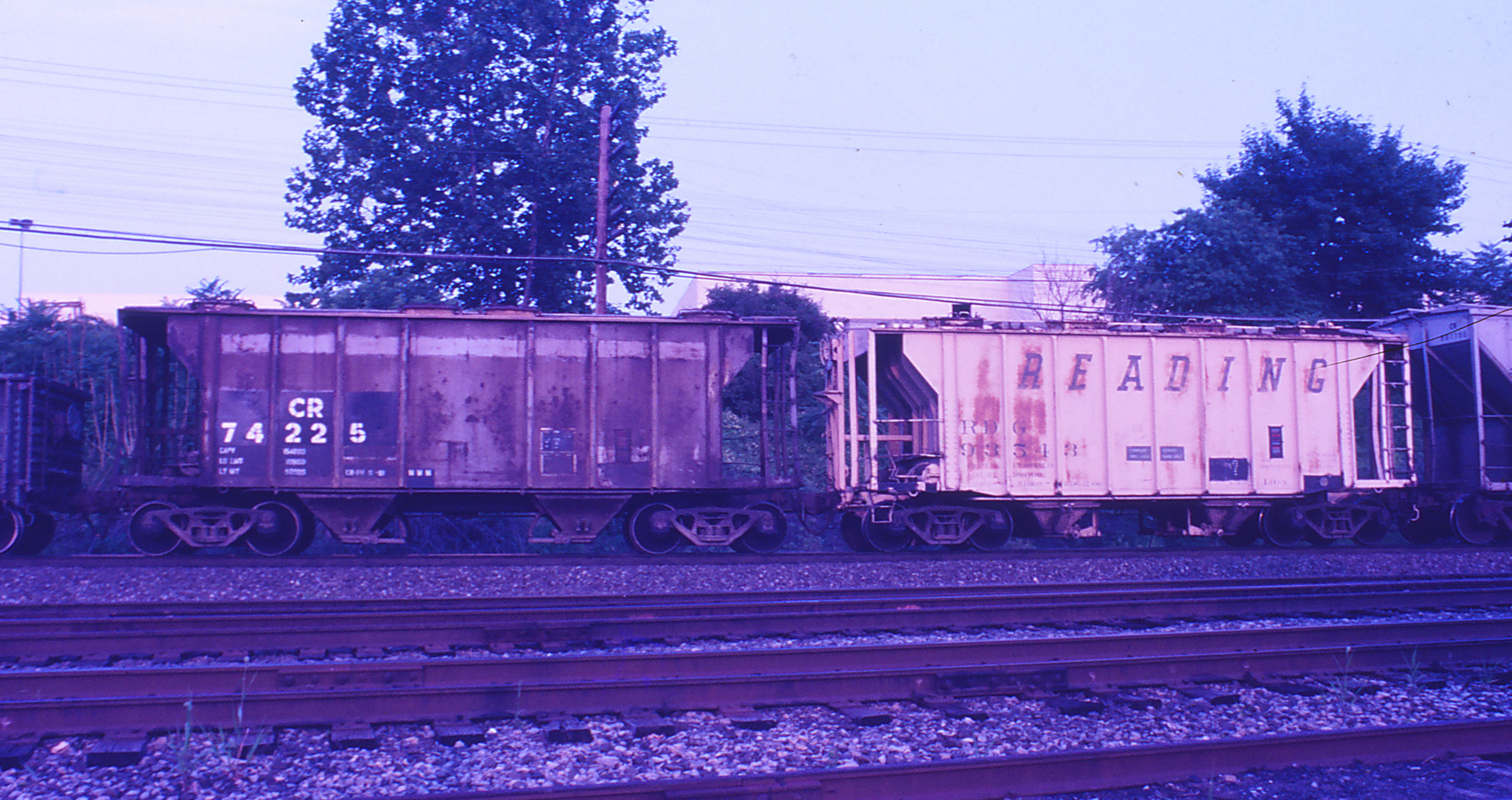 CR 74225 and RDG 93543 are seen at Reading, PA in July of 1988. CR 74225 is ex CNJ 2013/NAHX unknown, built 8-56 and was deleted by CR on 2/17/95. RDG 93543 is ex RDG 79595, built 10-53 and was deleted by CR on 4/4/98.