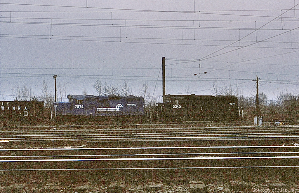 CR GP-10 7574 (ex-PC 7262) and GP-30 2240 work Morrisville yard in March, 1979.