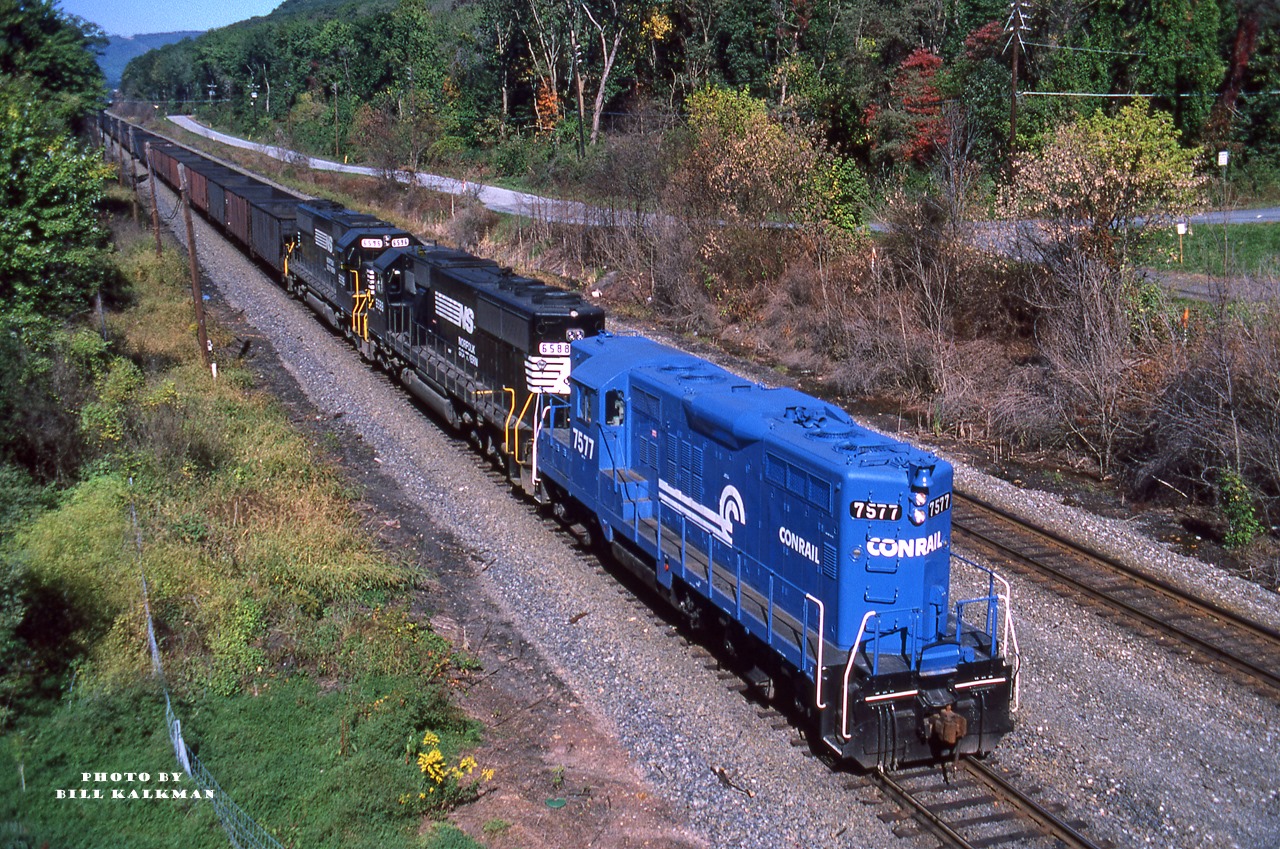 Conrail GP10 7577, with Norfolk Southern SD60s 6588 & 6596, is leading S/B empty coal hopper train XCI on CR's Buffalo Line, here, approaching the PA RT 443 overpass at Hecks.