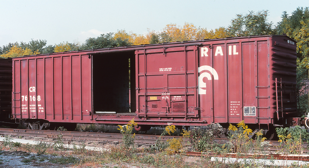 CR 76168 is seen in Rose Yard in Altoona PA on 10/5/97. Car is ex CR 161714/PRR 112810 and was built 1-65. Car was painted CR-BL 2-86.