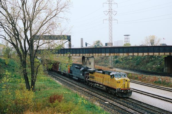 A westbound Conrail double-stack train led by GP38 7674 comes under the BN on Conrail CJ No. 2 Main in May 1991 at 14th street in Chicago, IL. Note that cool looking B&O CPL showing a proceed indication on the right side of the photo. The single track next to the signal was a B&OCT line. Doug Davidson photo with permission