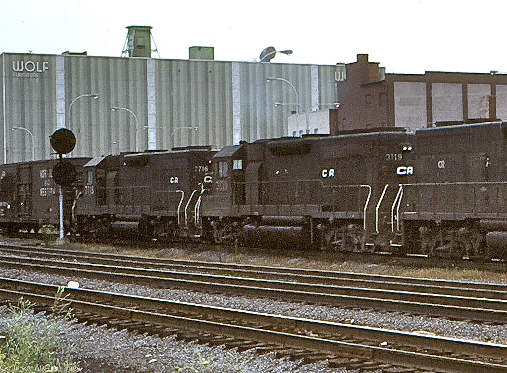 A trio of ex-PC power, GP-38 7891, GP-40 3119, and GP-38 7716 pull freight through Altoona in July, 1978.