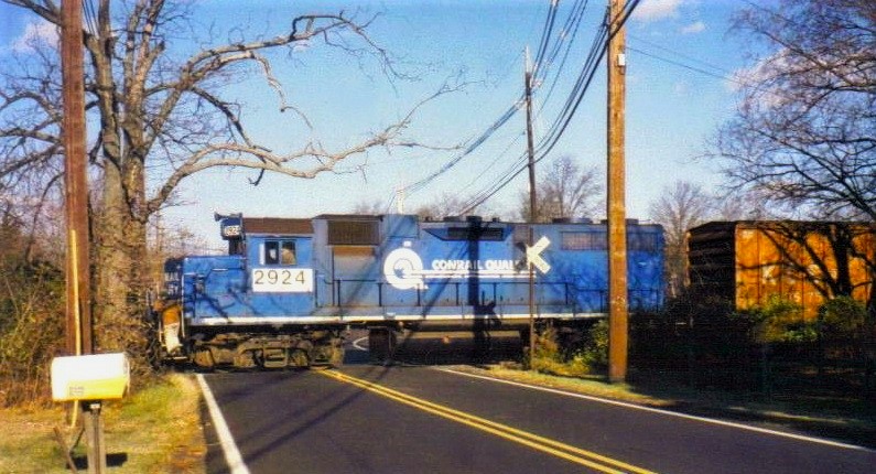 Conrail GP-38 #2924 at Clyde Road, Millstone branch, Somerset, NJ. This unit would be renumbered to Norfolk Southern GP38-2 #5652. The GP-38 was Penn Central & Conrail #7870, built in January 1971. This photo was taken in April 2001.