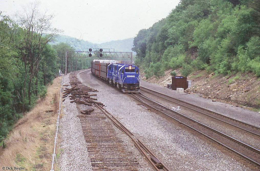 Conrail GP38-2 8099 is seen leading a westbound freight into CP-Jacks, just west of Mt. Union, PA in 1986. This shot is emblematic of the downsizing that had to be performed to make Conrail a viable business. It is clear that the number of tracks in this location was recently cut in half. Guessing from the elevation of Dick's shot, this photo was probably taken from inside JACKS Tower.