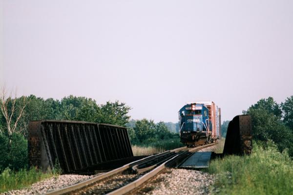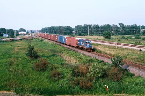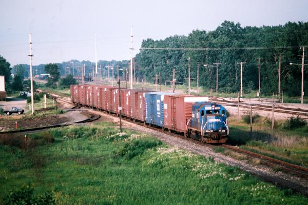 A Conrail local freight is seen on the ramp at 49th Street returning to Ashland Avenue Yard in March 1992. The former B&OCT 49th Street Tower is but a shell by this date. The ramp was former Chicago River & Indiana track that is also used by GTW intermodal trains to reach Railport Yard. The double track below is CSX's Blue Island Subdivision, and the far track is the remains of the former PRR Panhandle Line. Conrail uses this track to service an elevator at 51st Street. Doug Davidson photo with permission