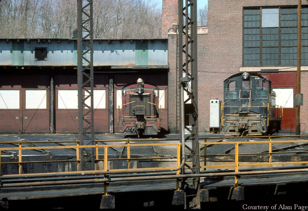 Former LV SW-8 258 (CR 8672) and PC NW-2 9160 rest at the Bethlehem roundhouse in April, 1977.