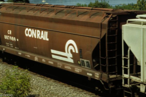 Conrail 887989 is seen at Lancaster, PA in the mid 1980s. Car is ex NYC 886296.