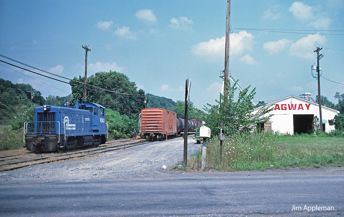 On its return to Northumberland Yard, CR WABL local with an SW1200 switches the Almedia Agway for the last time. The North Shore Railroad will take over operating the southern end of the former Lackawanna Branch the next day, 8/1/1984.