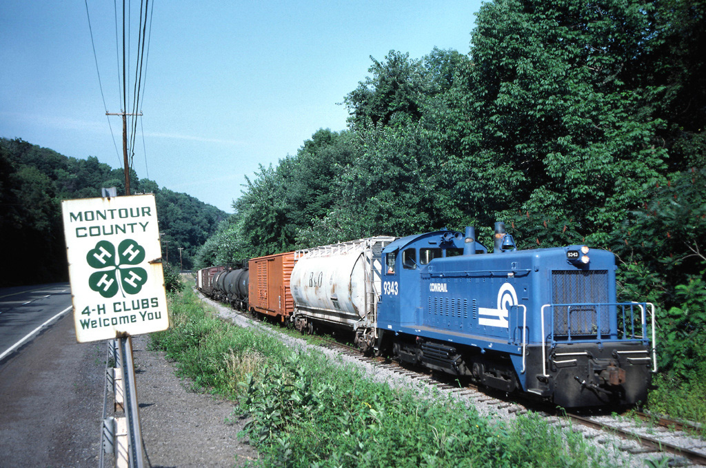 Conrail's WABL local on the Bloomsburg Branch leaves Montour County for the last time on its return to Northumberland Yard. The next day the North Shore Railroad would take over operating this branch.