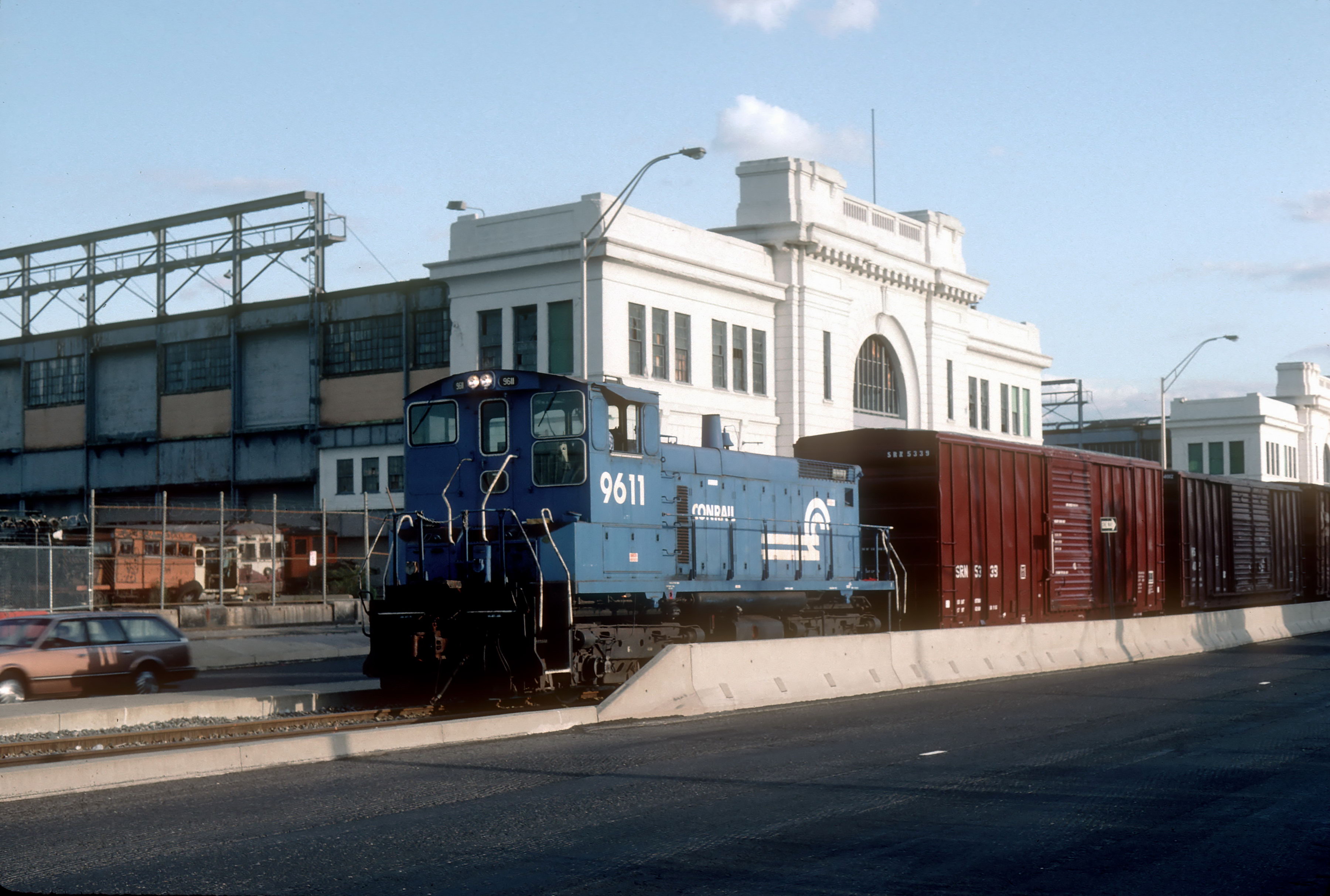 Conrail switcher working the old Belt Line Railroad trackage on Delaware Ave. (later renamed Christopher Columbus Blvd) at Pier 38, September 1991.