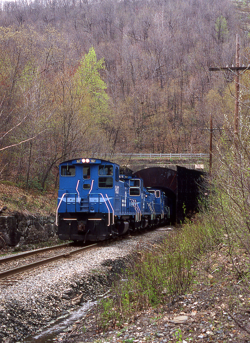 Conrail's eastbound Saturday light engine movement pops out of Mahanoy Tunnel, near Barnesville, PA on May 2, 1987, led by MP15 No. 9627.