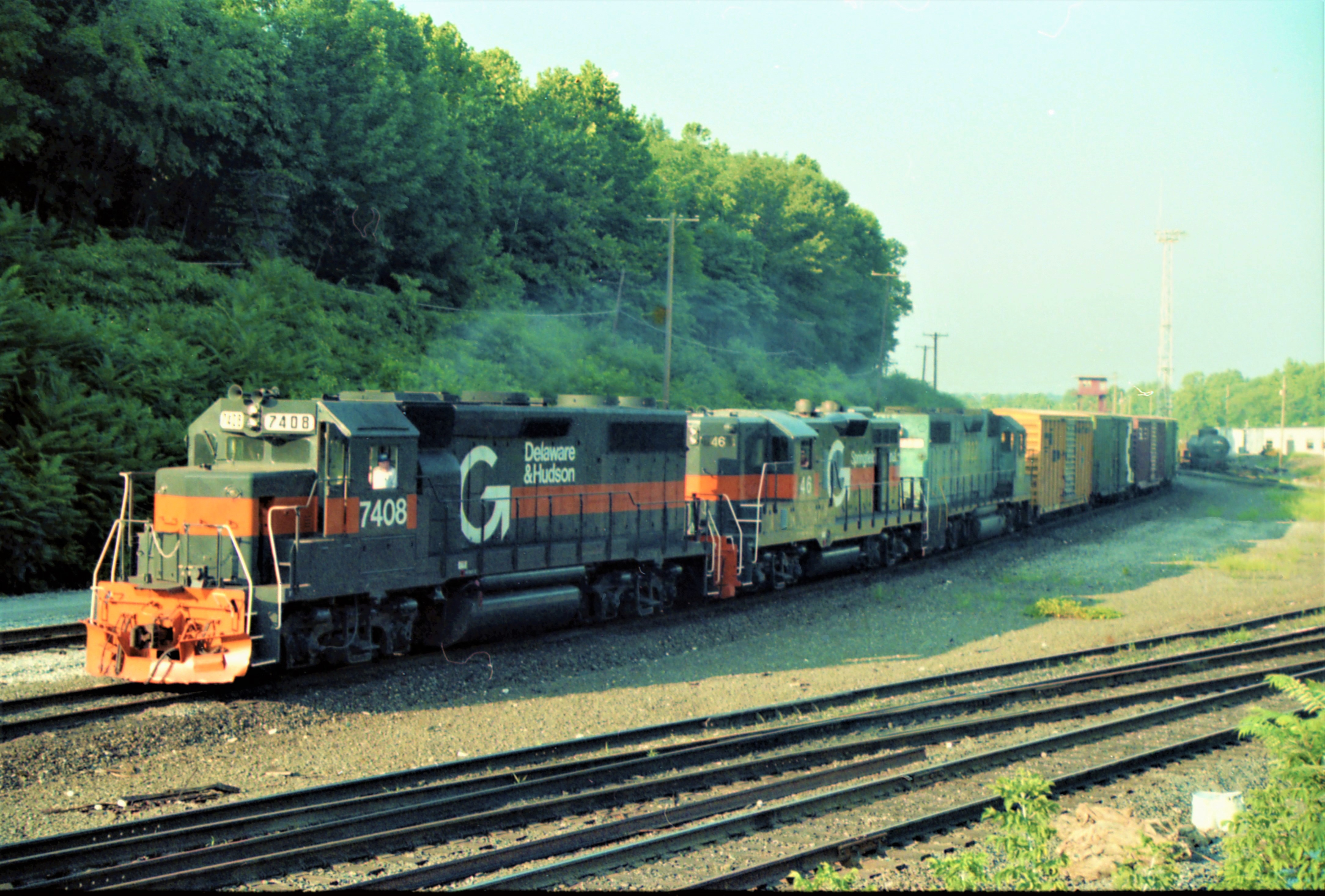 Guilford - Delaware & Hudson GP38-2 #7408, Springfield Terminal GP-9 #46 & other unit on freight entering the Allentown, PA yards.   August 25,1980.  The Delaware & Hudson used the freight yards at Allentown for interchange freight going north to Scranton, PA and points north.