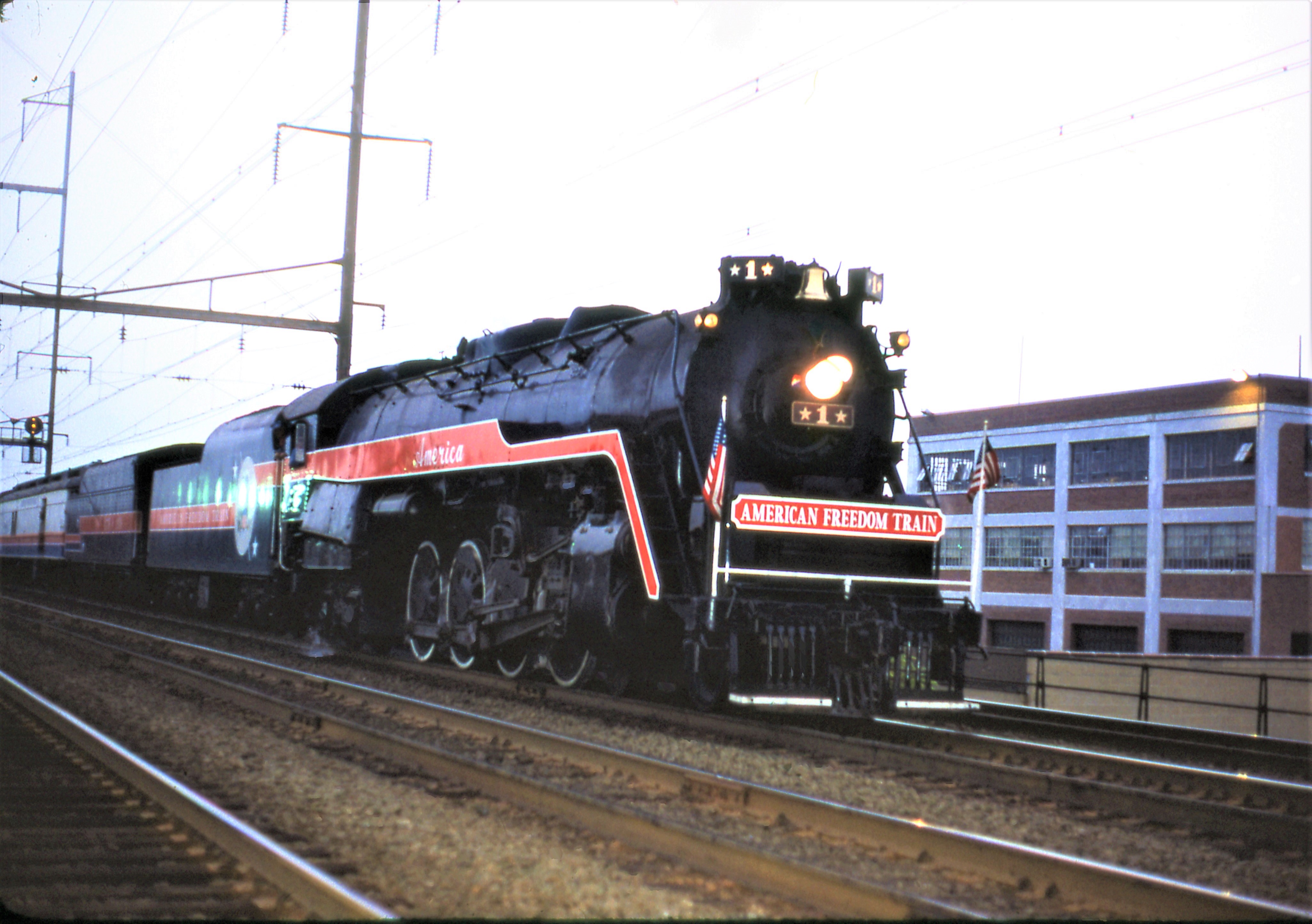 American Freedom Train arriving in New Brunswick, NJ. in the early morning around 6AM on September 5, 1978. The train is tarveling west to County Tower. The train was on display for a few days in the Handy Street yard and many people toured the cars.