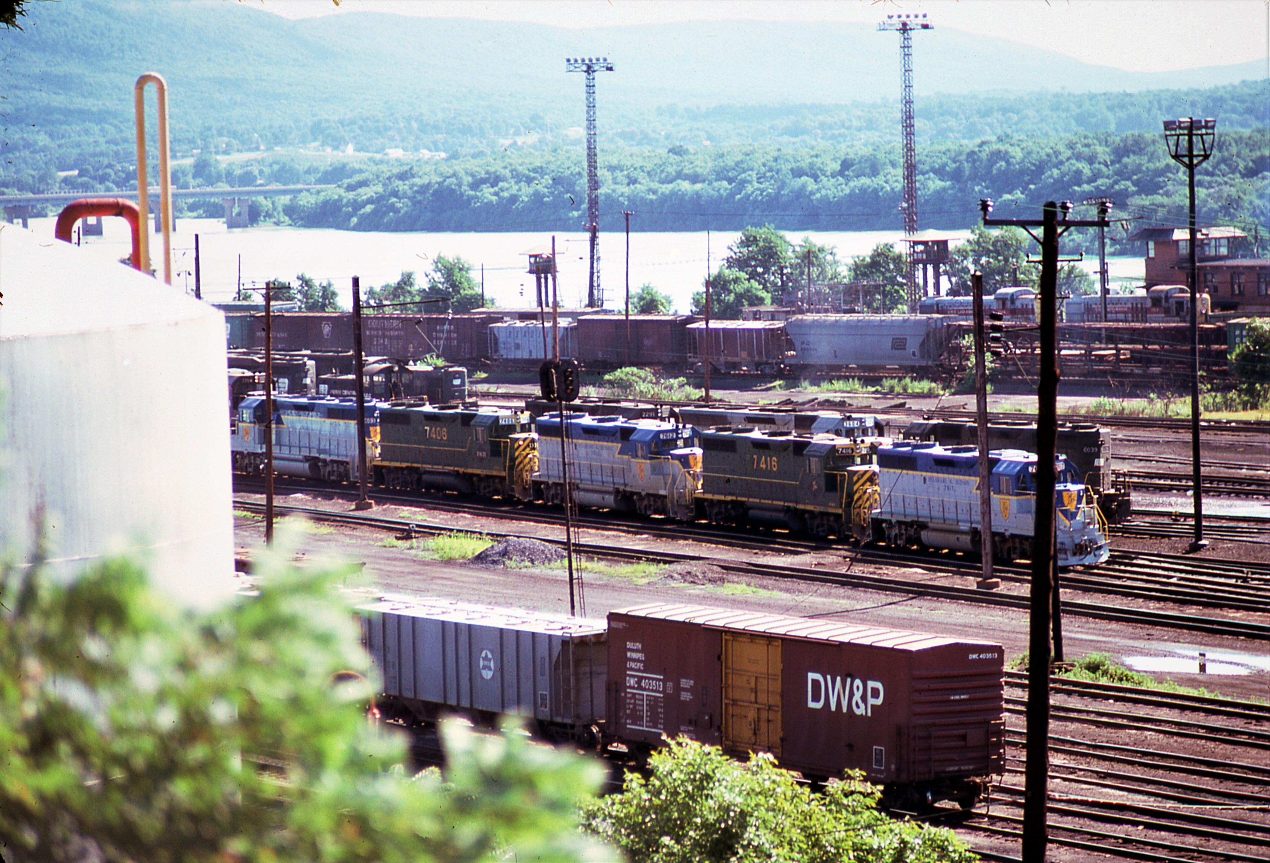 D&H GP39-2 #7603, ex Reading GP39-2 #7416, GP39-2 #7612, ex Reading GP39-2 #7406 & GP39-2 #7617. Enola engine terminal on July 15, 1976.  Enola provided many types of power over the years.  The D&H freight would go north on the P&E later in the day.