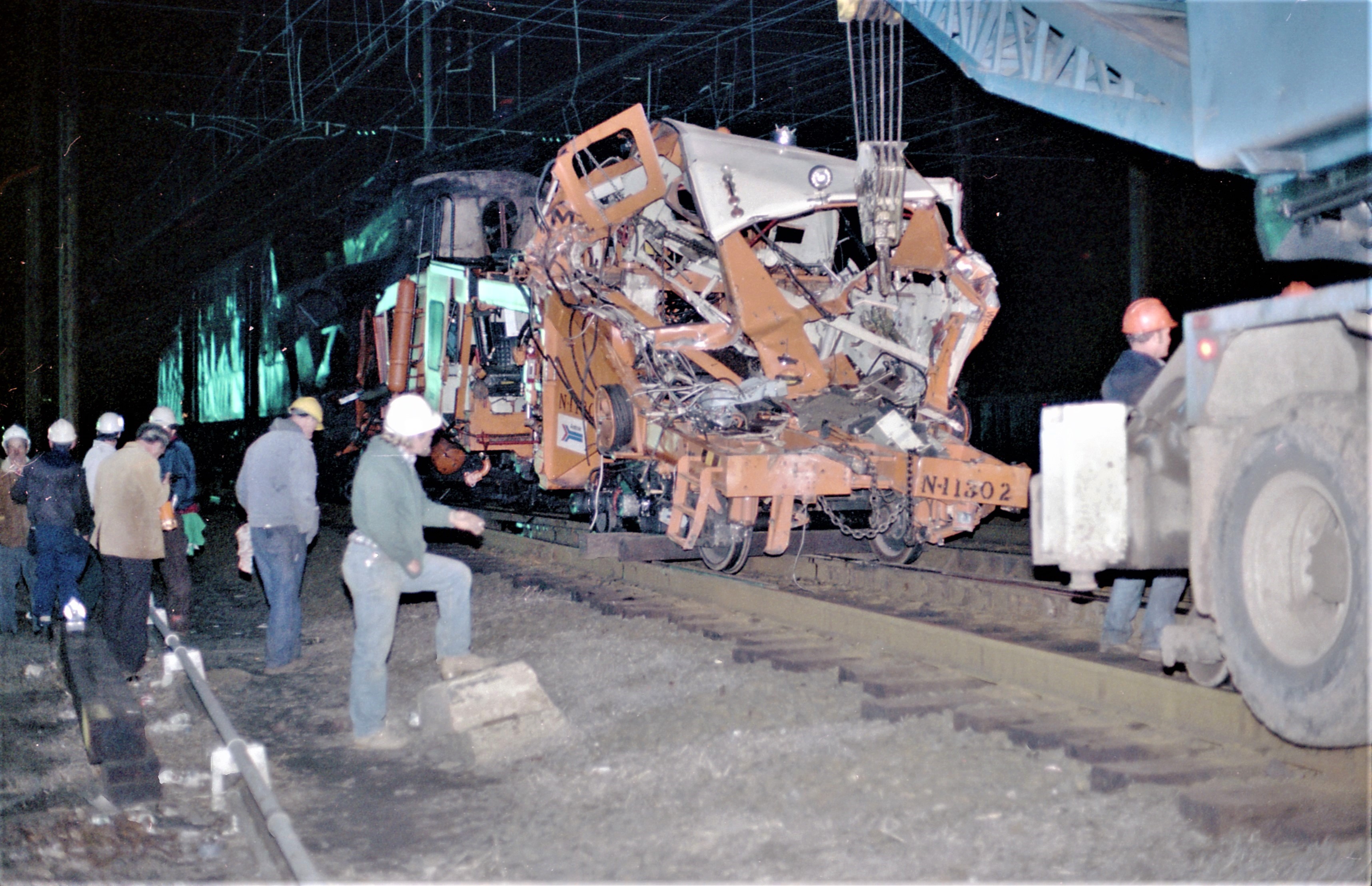 Amtrak GG-1 #918 with wreckage of maintenance equipment #N11302 from incident at Metuchen, NJ. March 19, 1979. Track 4 at County Tower, New Brunswick, NJ where the crew will separate the wreckage. Wreckage pushed by ex Reading SW1500 #9589.