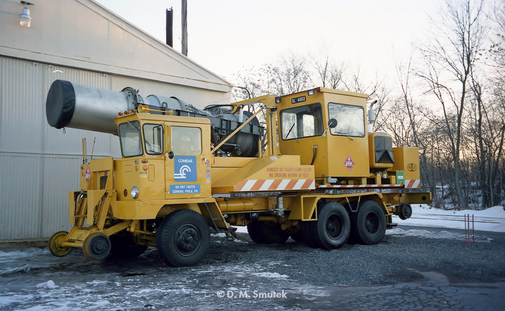 SL 4002 is seen at the CSAO South Plainfield MW Shop in the winter of 2001. This was an ESSCO Jet Snow Blower mounted on a repurposed Little Giant hi-rail crane carrier.