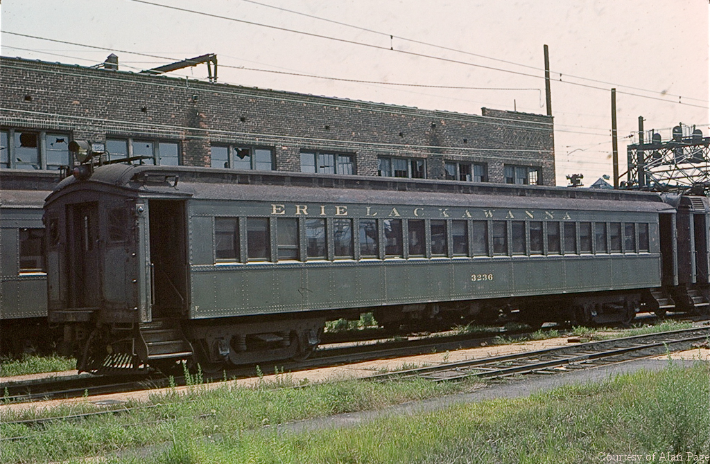 EL 3236, one of 50 low-roof trailer MU cars built by Pullman in 1925, rests with semi-pemanently coupled sister power car at Hoboken in August, 1977.