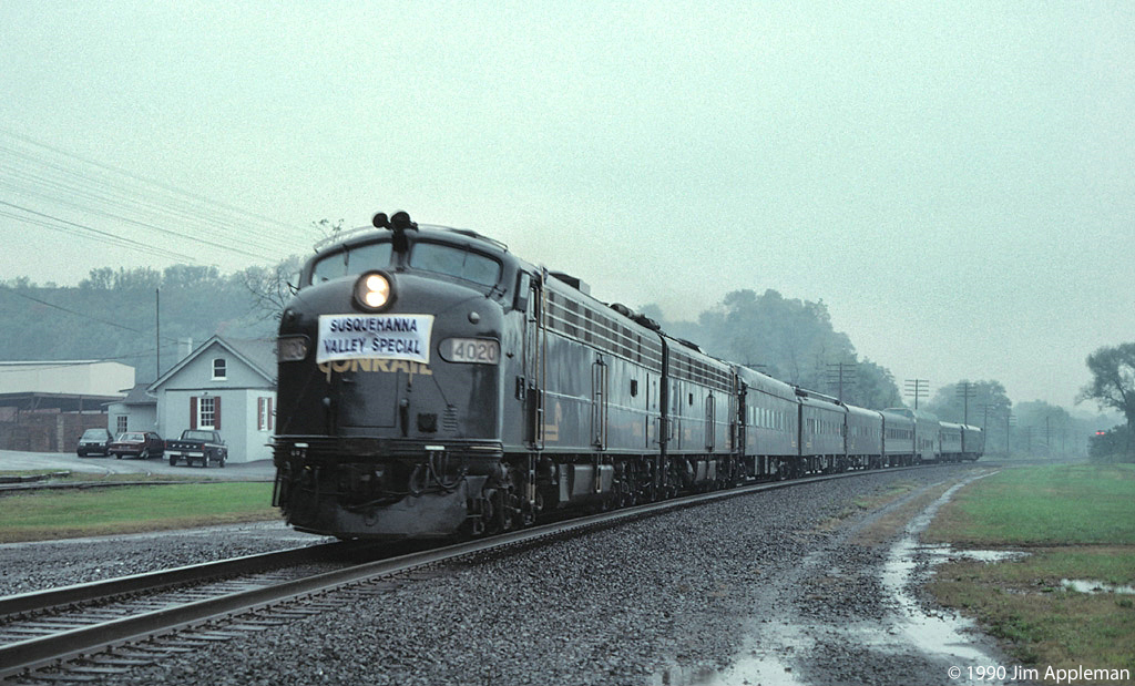 It's a rainy day and Conrail OCS Susquehanna Valley Special with 2 E8As and 7 business cars is on a trip from Harrisburg to Williamsport with area business leaders to promote economic development in the valley.