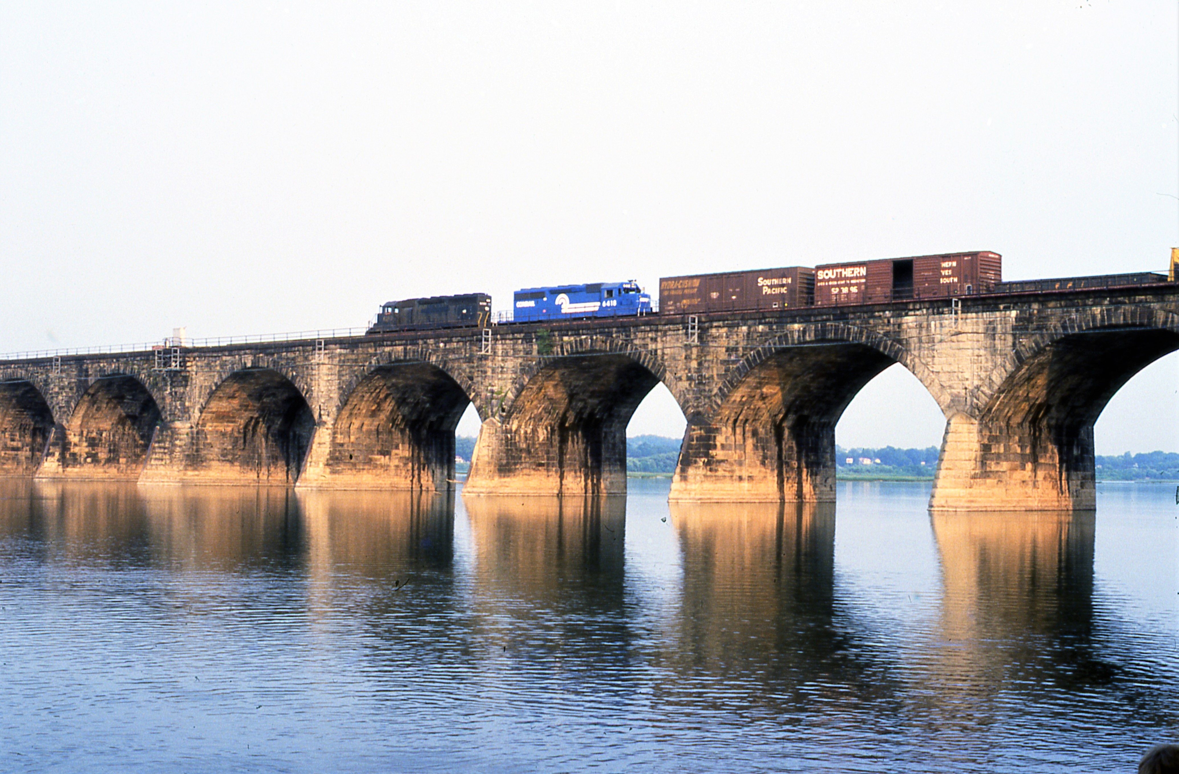 SD40 #5240, SD40-2 #6418, east bound freight on Rockville Bridge. Photo taken from boat ramp in Marysville, PA. August 15, 1978