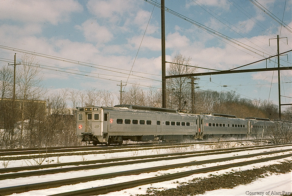 In commuter operations by CR for Septa, PC-lettered Silverliner IV 309 leads a quartet of MU's through Morrisville in March, 1978.