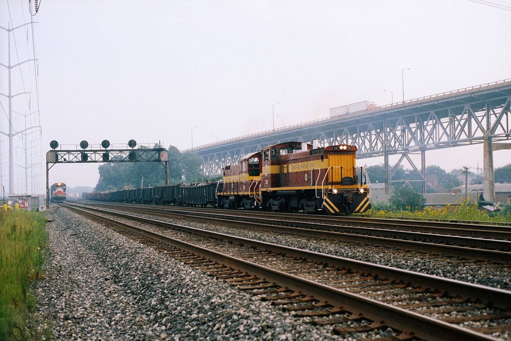 A Conrail freight behind BNSF (former BN) LMX power(most likely ELBN) holds at the Calumet River home signal, while a CSL train heads west on Conrail's Chicago Line behind SW1500 No. 31 and SW1001 No. 28, in September 1997. Doug Davidson photo with permission