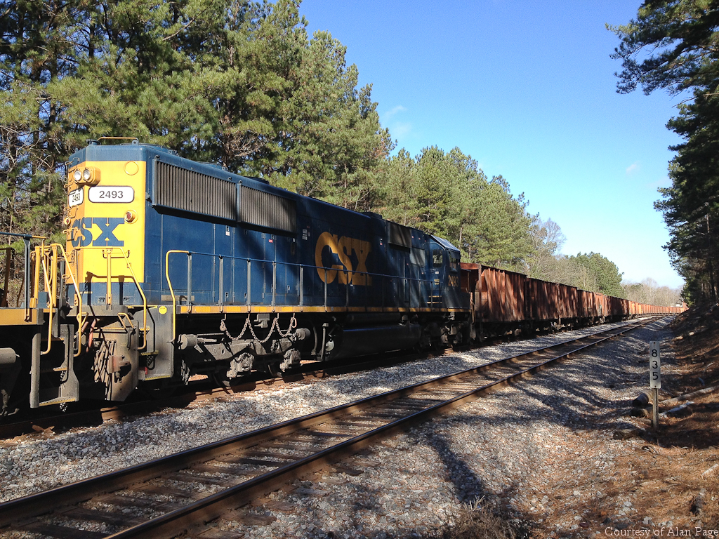 CSXT SD40-2 8369 (ex-C&O 7510) and SD50-2 2493 (CSX 8670/CR 6760) wait for clearance with a line of hoppers at mile 835 in Tyrone, GA on February 8, 2015.