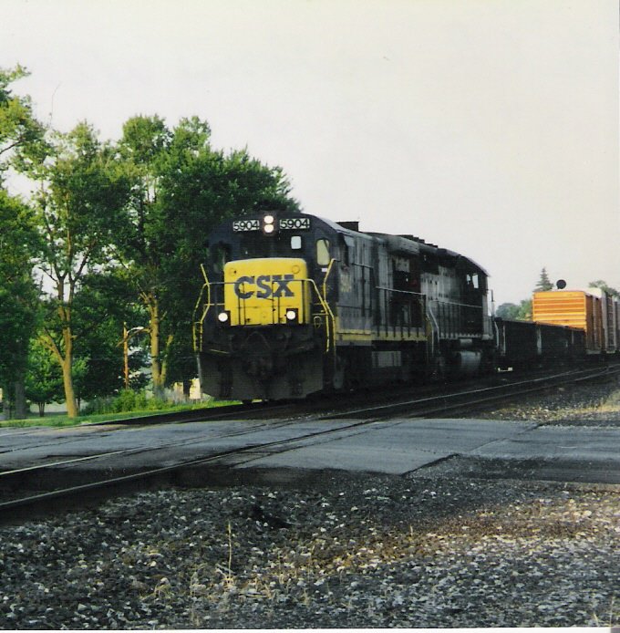 CSXT 5904 and a SP EMD lead an unknown westbound at Waterloo, IN on July 5, 1996