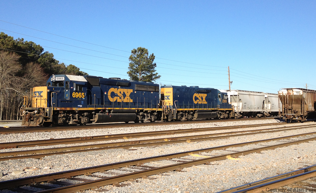 CSXT GP40-2 6965 (CSX 4438/CR 3366) and mate 2365 (CSX rebuilt GP40 9724/B&O 4036) pause from working the Fairburn sorting yard on February 7, 2015.