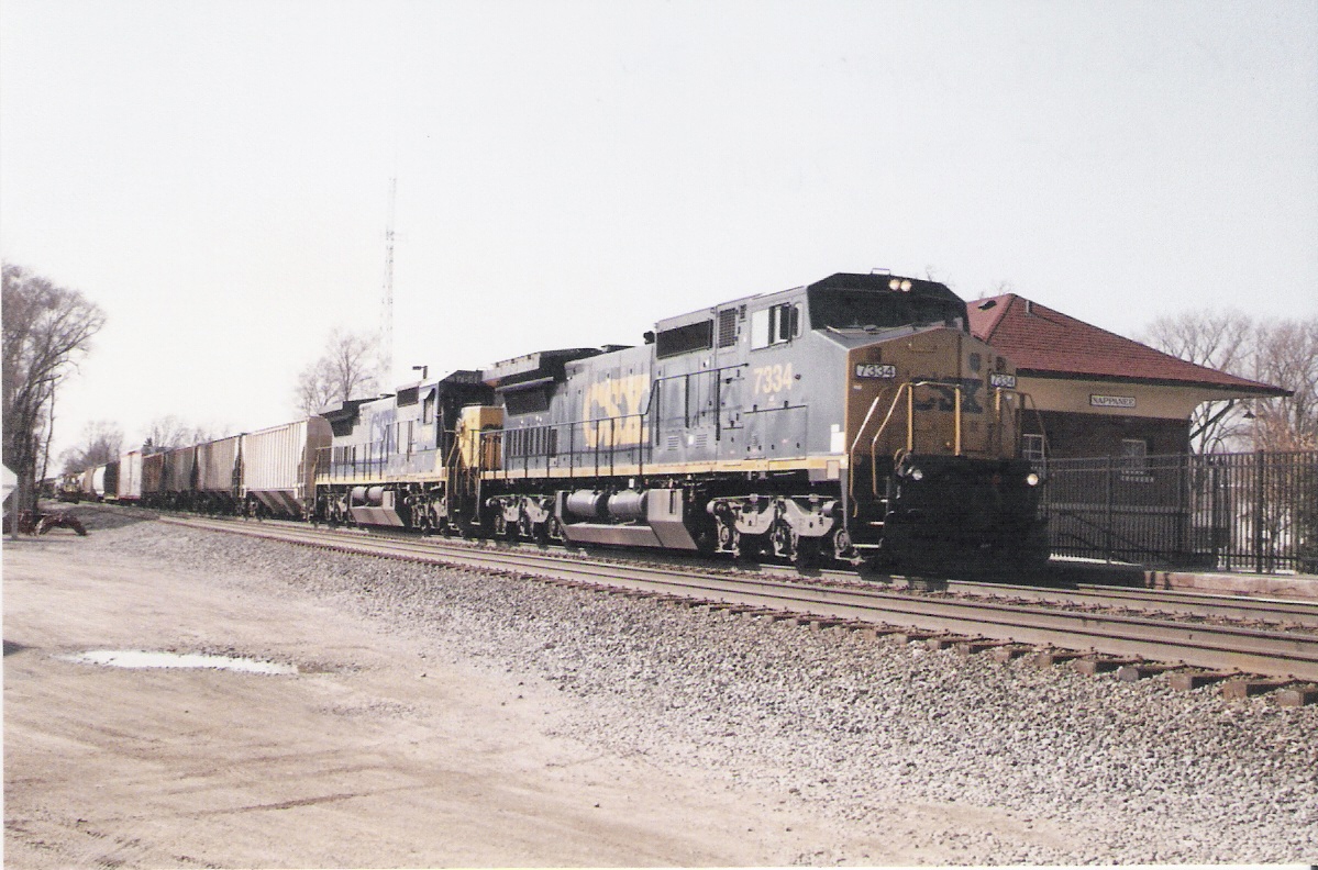 CSX Q388 led by CSXT 7334, ex CR 6138, and 7641 at Nappanee, IN on March 19, 2011.