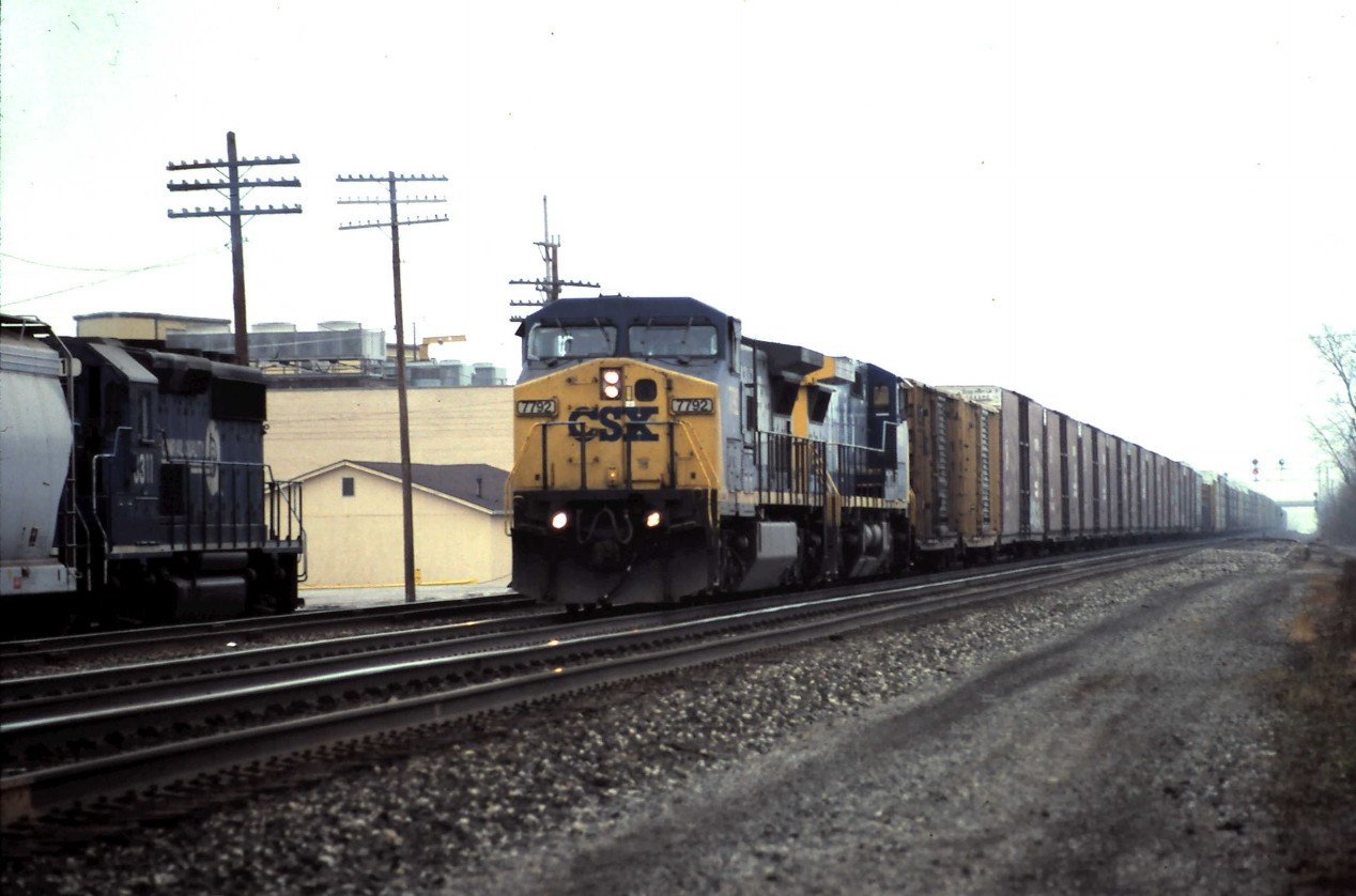 CSXT 7792 and fellow GE powers ELBU-2 at Bryan, OH on April 2, 1999. Chris Howe photo