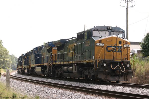 CSX 3318, 3438, and C40-8W 7920 (LMS 702) push a stack train into the Fairburn Intermodal Facility on June 20, 2018.