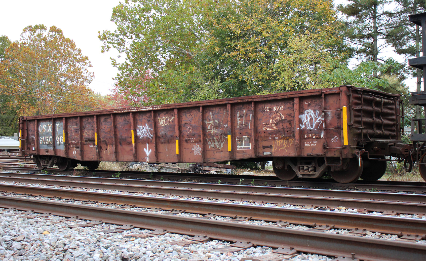 CSXT 915096 is seen at Perryville, MD on 10/26/19. Car is ex NYC 583779/CR 583779/CR 622981/RDG 38617, built 6-69 and was cleaned CR-SR 10-5-90. Car was in coil steel service at one time as "COIL STEEL LOADING ONLY" is stenciled near the top cord in the center of the car.