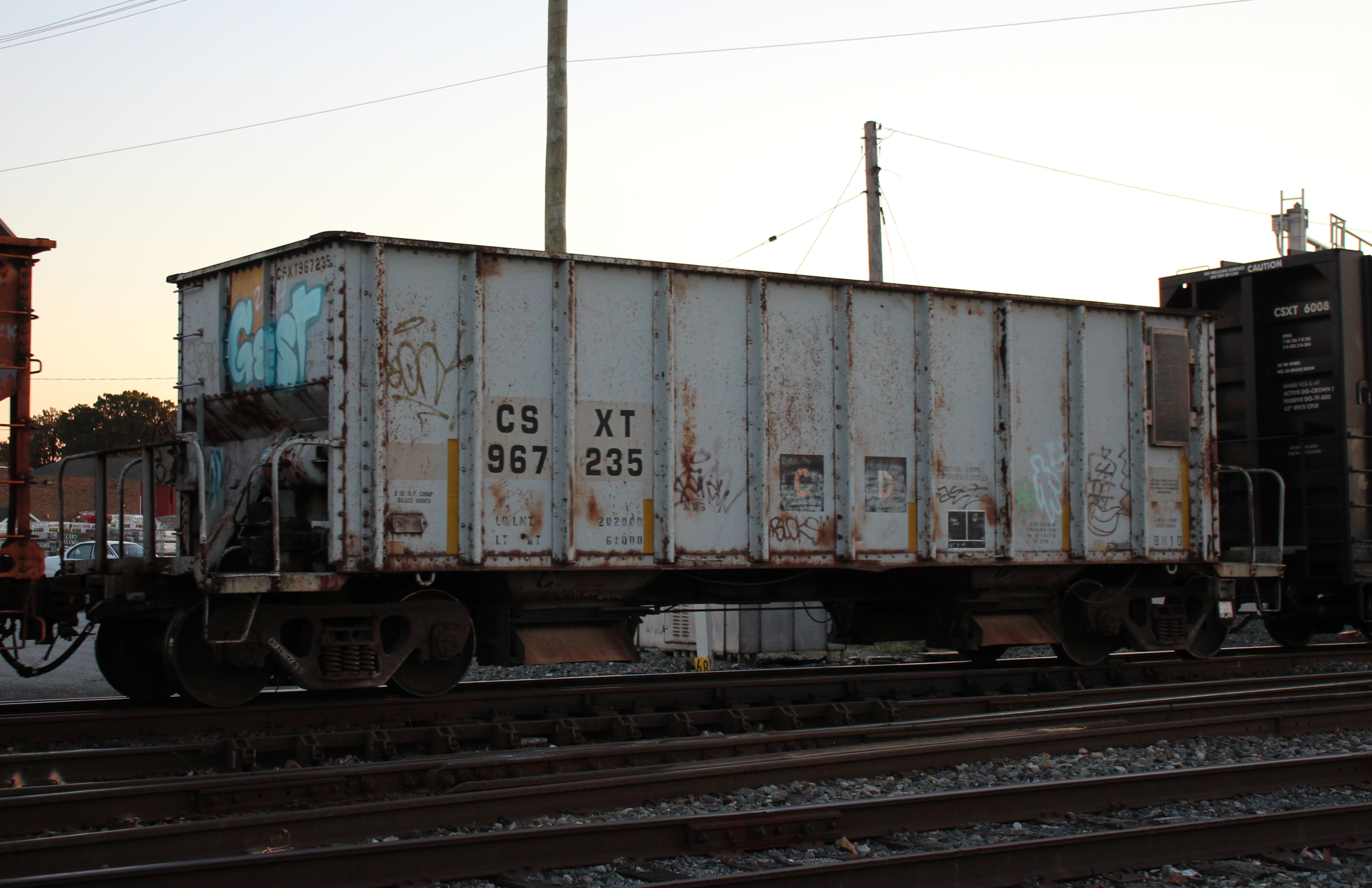CSXT 967235 is seen in the consist of CSX M419-23 at Elsmere, DE on 10/24/25. Car is ex CR 53240 and was built 2-87 by HCS.