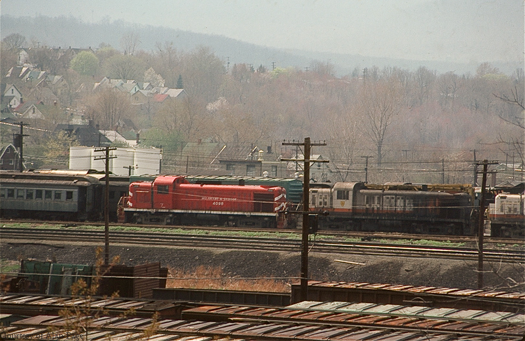 D&H RS-3 4098, in Fire Engine Red paint, rests between a NYC coach and an orange and white D&H RS-3 at one of the Juniata shops deadlines in March, 1978.
