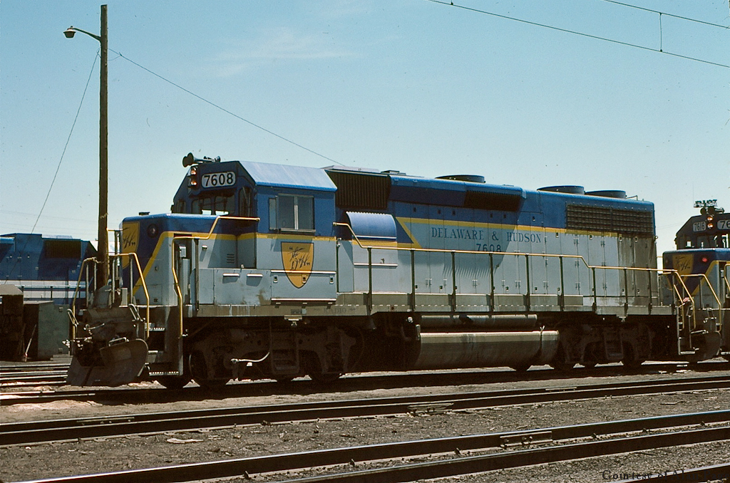 D&H GP-39-2 7608 in a trio of D&H units at Enola in June, 1977.